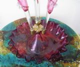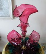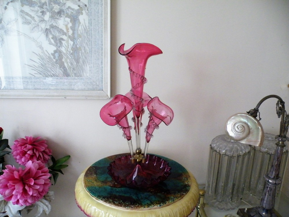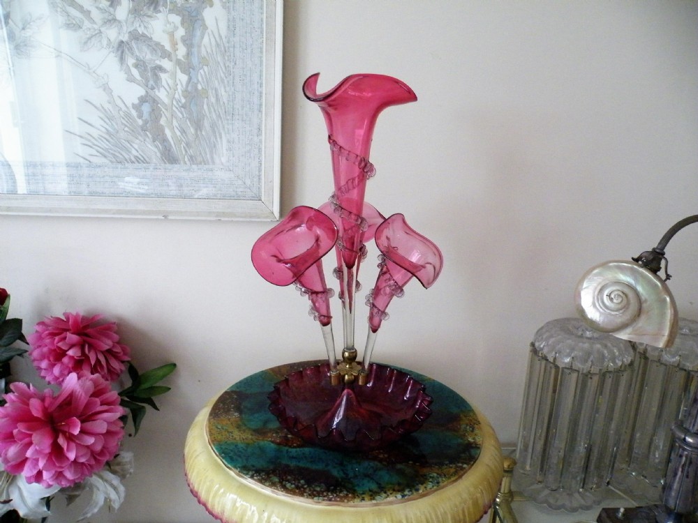 A GENUINE VICTORIAN CRANBERRY GLASS EPERGNE IN THE JACK IN THE PULPIT DESIGN HAVING A TALL CENTRAL TRUMPET FLANKED BY THREE SIDE TRUMPETS ALL HAVING APPLIED CRIMPED GLASS RIGAREE CRIMPED EDGE BOWL HEIGHT 18 INCHES BOWL DIAMETER 9 INCHES GOOD CONDITION FREE UK POST WE WILL SHIP WORLDWIDE