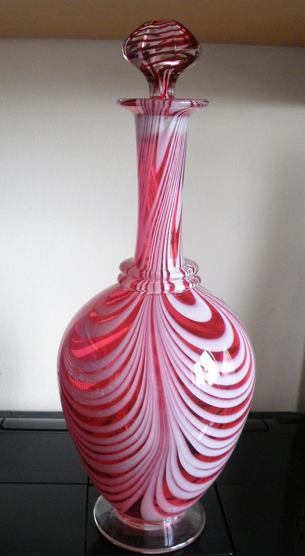 MANY MORE ANTIQUE GLASS ITEMS ON MY WEB SITE www.johnferrara-antiqueglass.co.uk.asp ________________________________________ A RARE LARGE 19th CENTURY CRANBERRY GLASS DECANTER WITH WHITE PULL UP DECORATION DECANTER HAVING AN OVOID SHAPE BODY TWO COLLAR RINGS LONG NECK WITH LIP SPOUT ORIGINAL STOPPER THE CRANBERRY GLASS HAVING WHITE PULL UP DECORATION CLEAR GLASS CIRCULAR FOOT THIS DECANTER WAS MADE IN EITHER NAILSEA OR STOURBRIDGE HEIGHT TO TOP OF STOPPER 34cm LOVELY UNDAMAGED CONDITION READY TO USE FREE UK POST WE WILL SHIP WORLDWIDE MANY MORE ANTIQUE GLASS ITEMS ON MY WEB SITE www.johnferrara-antiqueglass.co.uk.asp