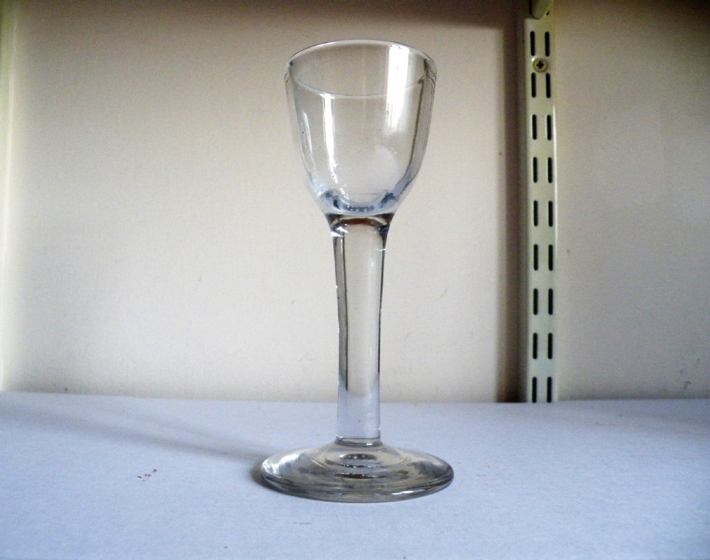 A GEORGIAN PLAIN STEM WINE OR CORDIALGLASS HAVING A DRAWN CUP SHAPE BOWL PLAIN STEM CIRCULAR CONICAL FOOT WITH A GROUND PONTIL HEIGHT 15cm BOWL DIAMETER 5.5cm FOOT DIAMETER 7cm FREE UK POST WE WILL SHIP WORLDWIDE