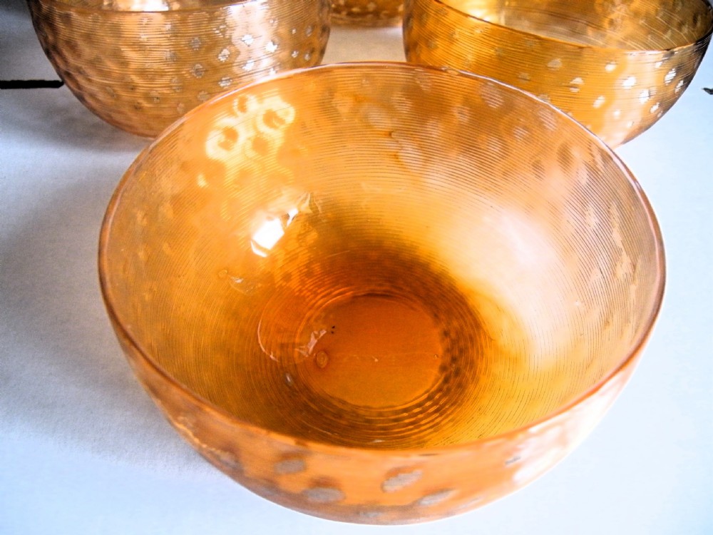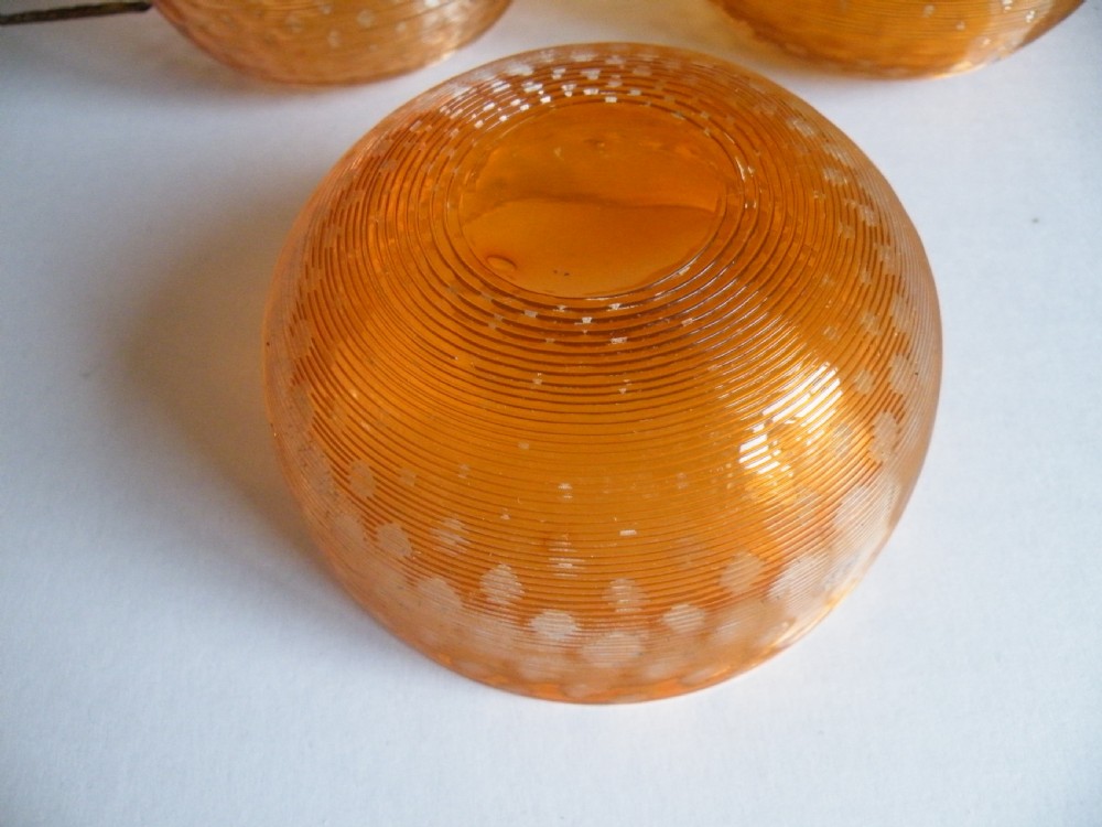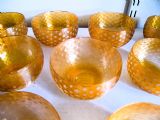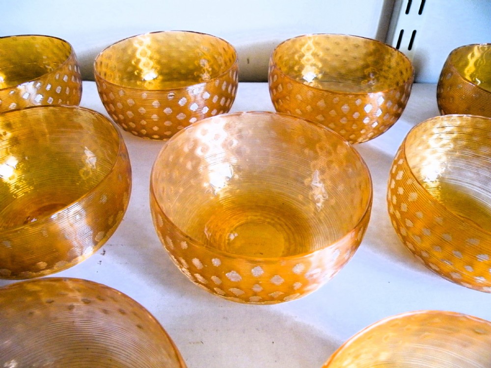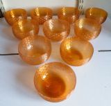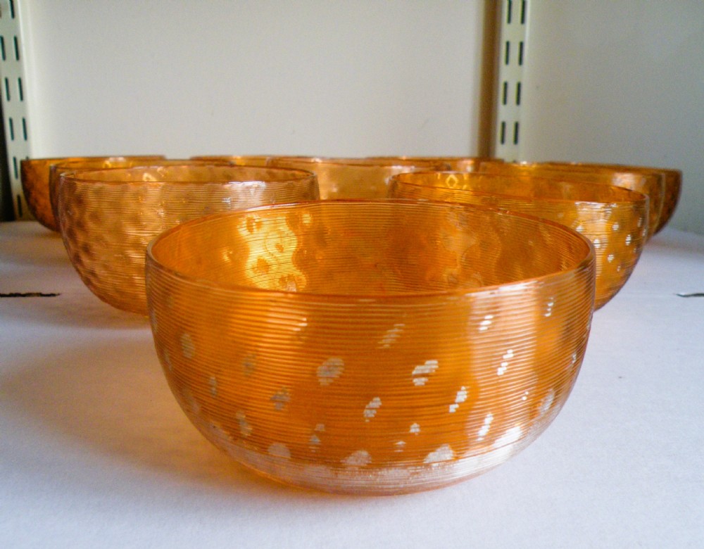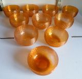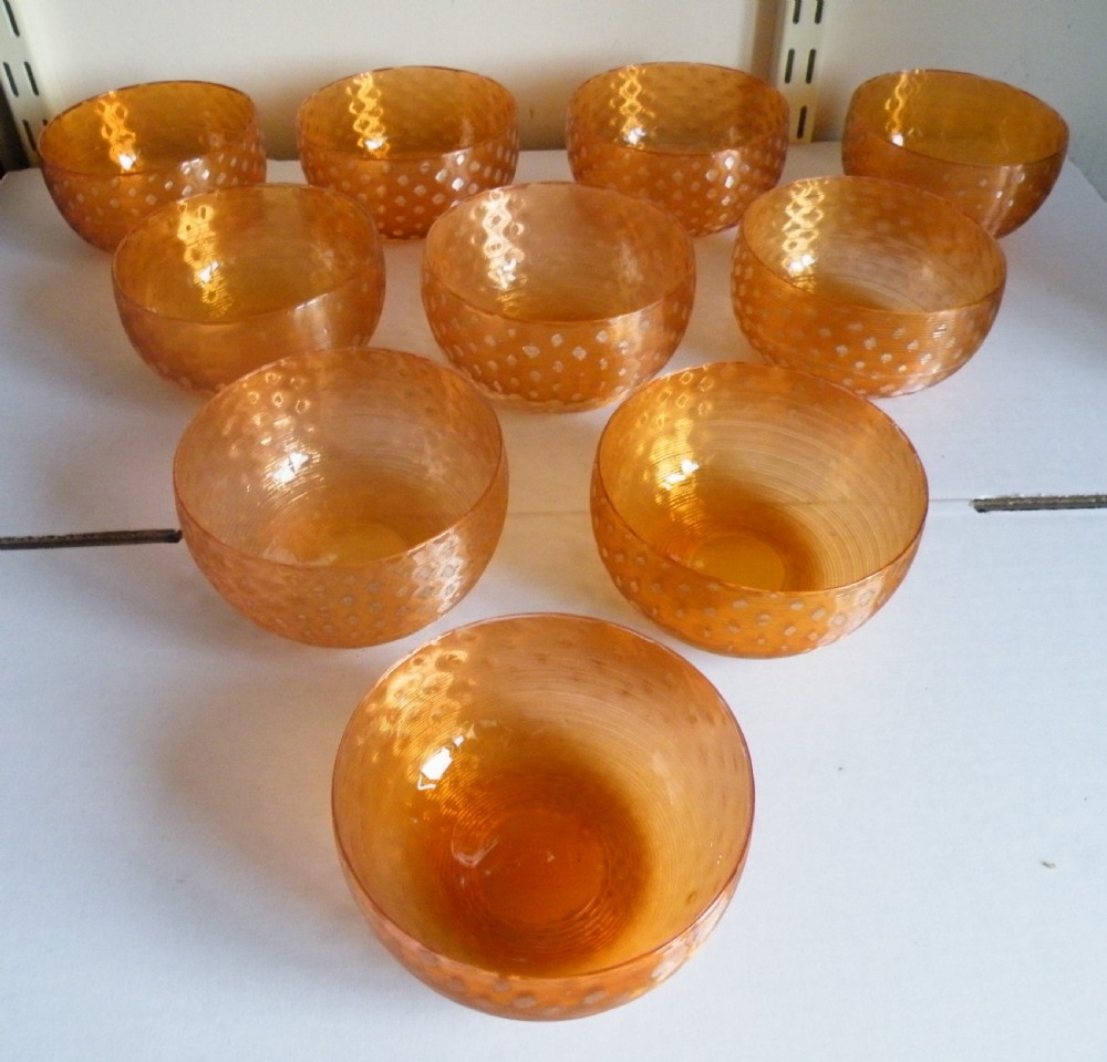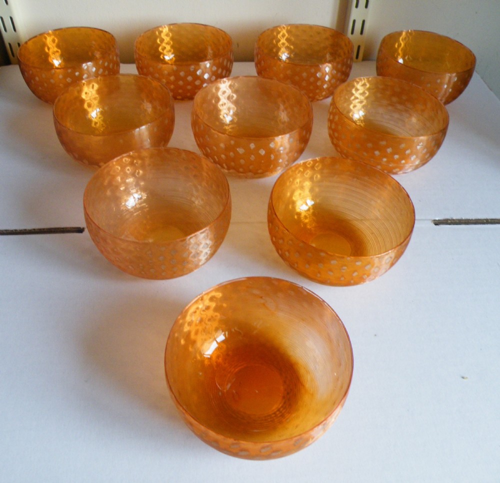 MANY MORE ANTIQUE GLASS ITEMS ON MY WEB SITE www.johnferrara-antiqueglass.co.uk.asp ________________________________________ A FINE SET OF 10 VICTORIAN AMBER GLASS TRAILED FINGER / DESSERT BOWLS PROBABLY BY STEVNS AND WILLIAMS OF STOURBRIDGE HAVING A TRAILED AND BUBBLE TYPE DECORATION HEIGHT 5.5cm DIAMETER 10cm VERY GOOD CONDITION READY TO USE FREE UK POST WE WILL SHIP WORLDWIDE