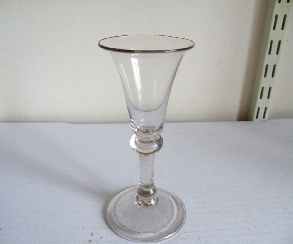 AN EARLY 18th CENTURY BALUSTROID STEM GIN GLASS HAVING A FLARED BELL BOWL SHAPE LARGE BOWL BASE BALL KNOP PLAIN STEM LEADING TO A BASE BALL KNOP HAVING A CONICLE FOLDED FOOT HEIGHT 13.5cm BOWL DIAMETER 5.75cm FOOT DIAMETER 6.5cm GOOD CONDITION NO CHIPS OR CRACKS FREE UK POST WE WILL SHIP WORLDWIDE MANY MORE ANTIQUE GLASS ITEMS ON MY WEB SITE www.johnferrara-antiqueglass.co.uk
