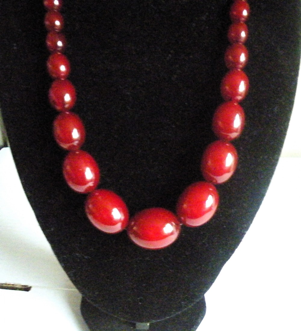 PLEASE NOTE THAT FOR THIS ITEM PAYMENT WILL ONLY BE ACCEPTED BY DIRECT BANK TRANSFERE. IF PAYMENT IS MADE BY PAYPAL THE ITEM WILL NOT BE SENT . DUE TO THE MANY ATTEMPTED SCAMS. A GOOD ART DECO CHERRY AMBER BAKELITE BEAD NECKLACE CONSISTING OF 66 GRADUATED BEADS THE LARGEST BEING 3cm x 2cm ALL WITH ORIGINAL STRINGING LENGTH 32 INCHES WEIGHT 91 GRAMS GOOD CONDITION FREE UK POST WE WILL SHIP WORLDWIDE
