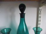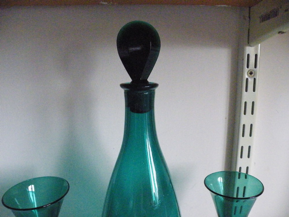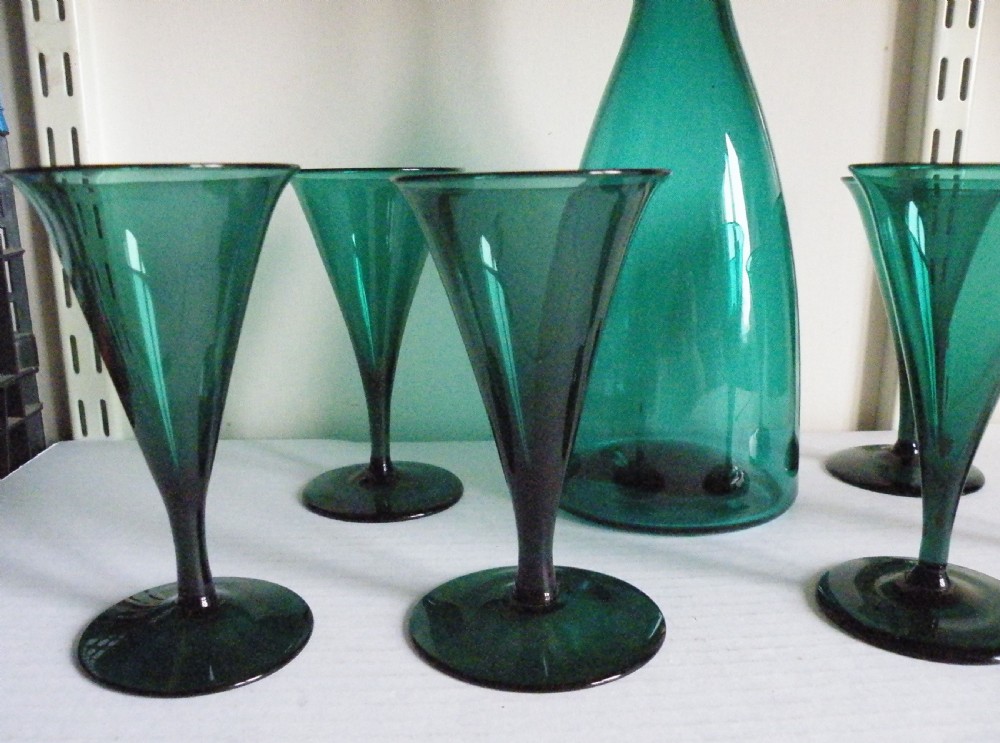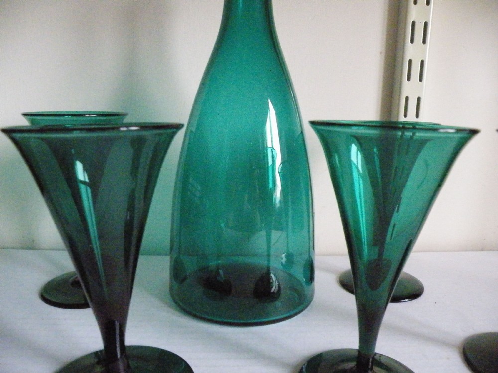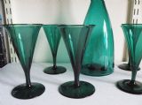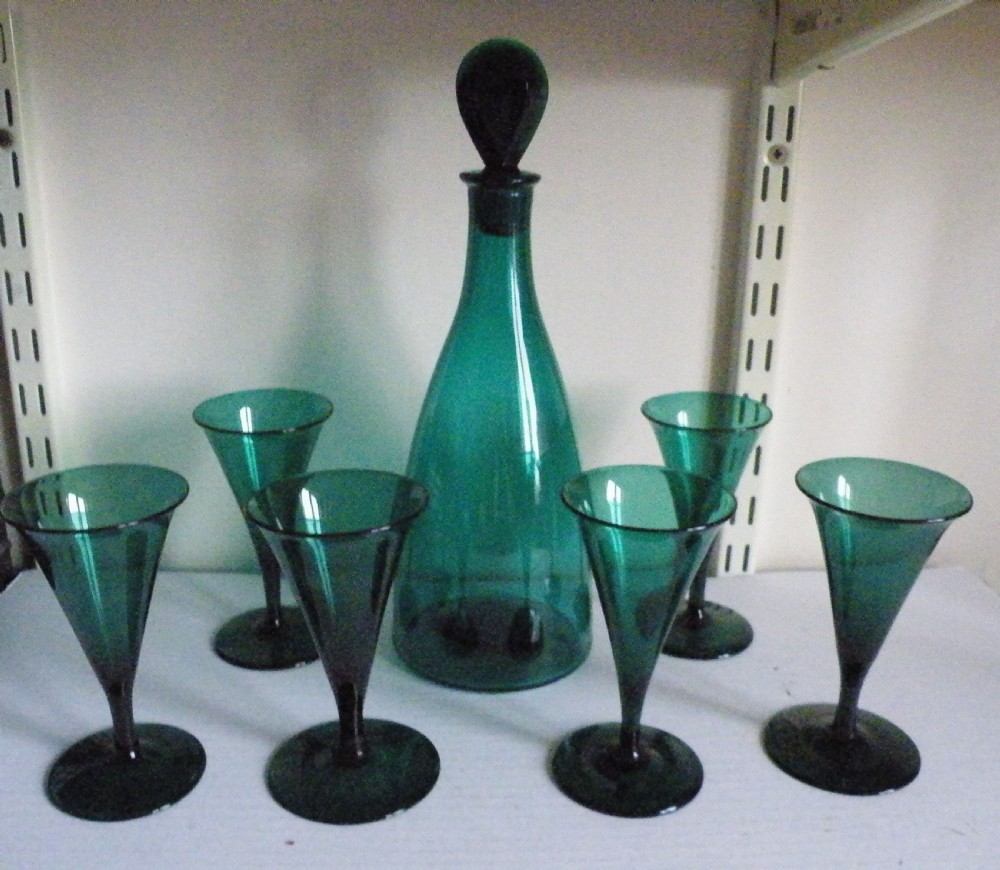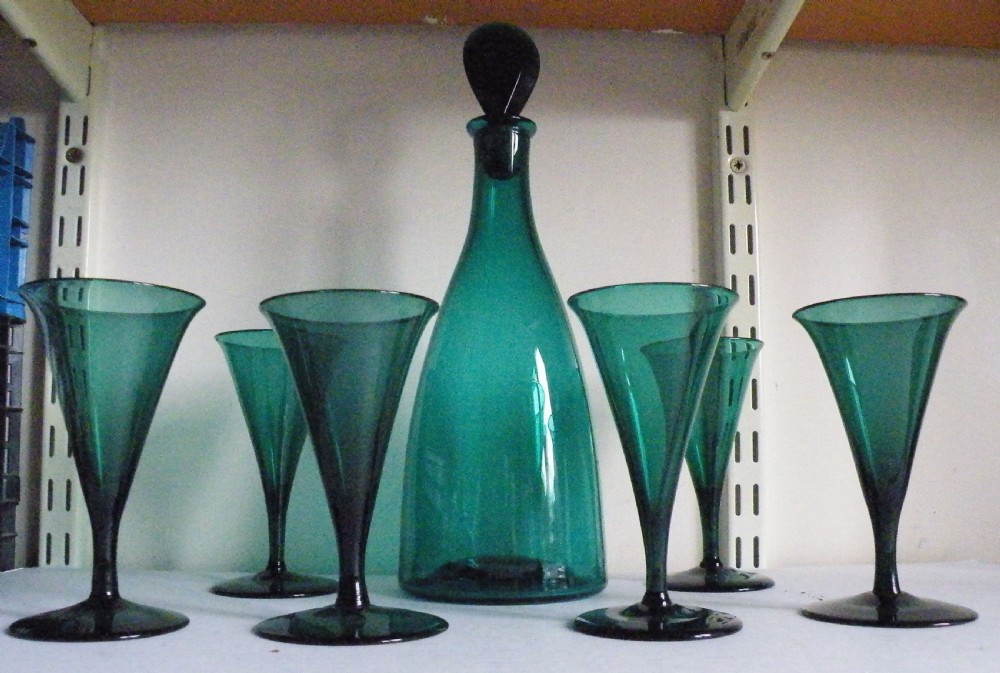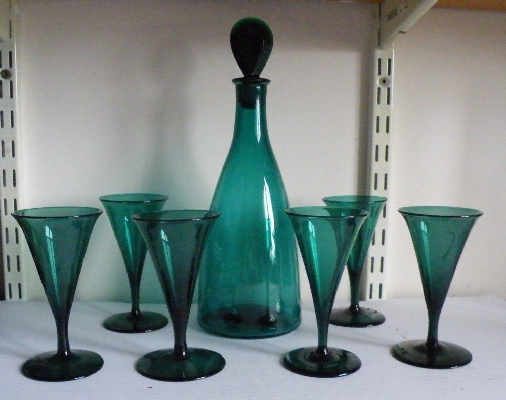 a fine set of six 18th century bristol green wine glasses with matching decanter
