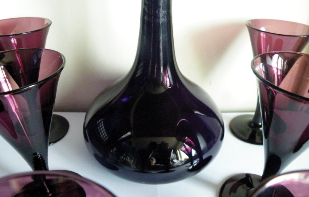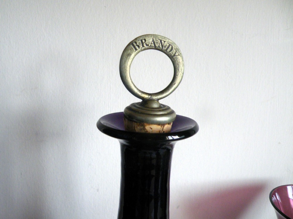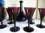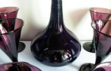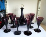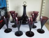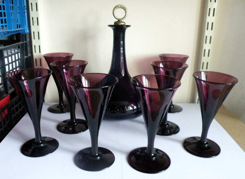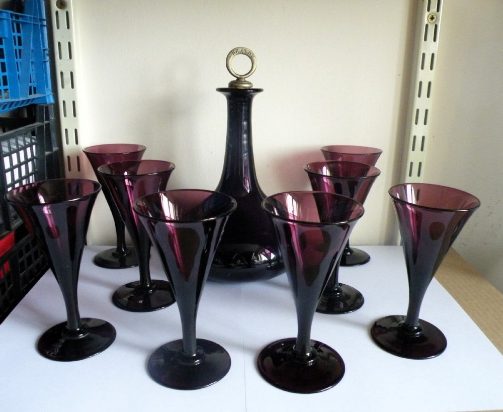 A GOOD GEORGIAN AMETHYST GLASS SUITE OF DECANTER AND EIGHT WINE GLASSES HAVING AN AMETHYST GLASS SHIPS DECANTER THE DECANTER OF TYPICAL SHAPE WITH A CORK AND PLATE STOPPER THE STOPPER ENGRAVED "BRANDY" WITH EIGHT AMETHYST WINE GLASSES HAVING CONICAL SHAPE BOWLS HEIGHT OF DECANTER TO TOP OF STOPPER 23 cm HEIGHT OF WINE GLASSES 13 cm ALL IN VERY GOOD CONDITION NO CHIPS OR CRACKS FREE UK POST WE WILL SHIP WORLDWIDEMANY MORE ANTIQUE GLASS ITEMS ON MY WEB SITE www.johnferrara-antiqueglass.co.uk.asp