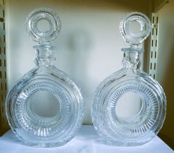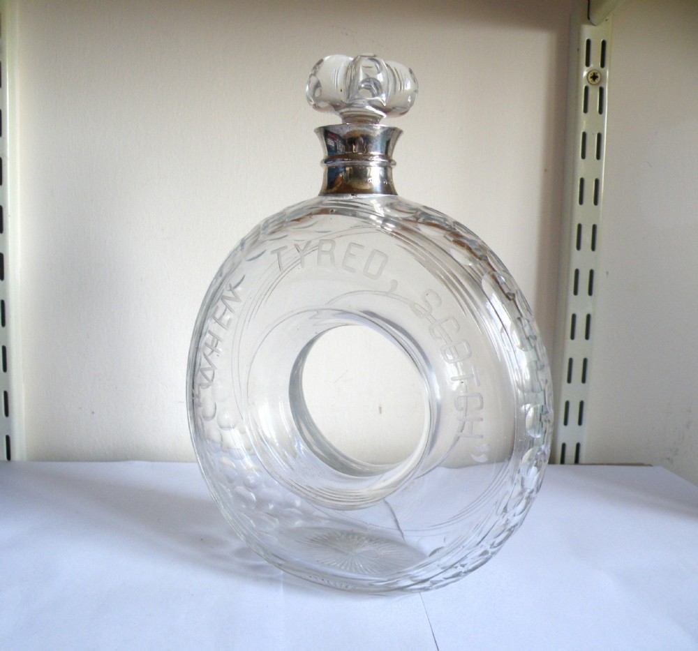 A RARE 1908 GLASS TYRE SHAPE DECANTER ENGRAVED "WHEN TYRED, SCOTCH"