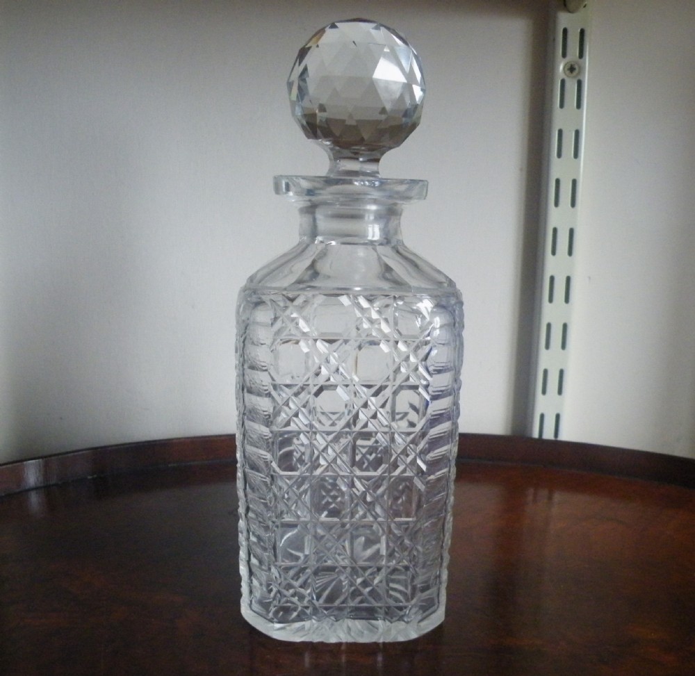 A 19th CENTURY HOB NAIL CUT SQUARE WHISKY DECANTER HAVING TRUE HOBNAIL CUTTING TO THE BODY PANEL CUT SHOULDERS STAR CUT BASE LARGE BALL SHAPE FACETED STOPPER HEIGHT TO TOP OF STOPPER 26cm BASE 9 X 9 cm SMALL FLEA BITE TO RIM OF LIP OTHERWISE GOOD CONDITION FREE UK POST WE WILL SHIP WORLDWIDE