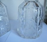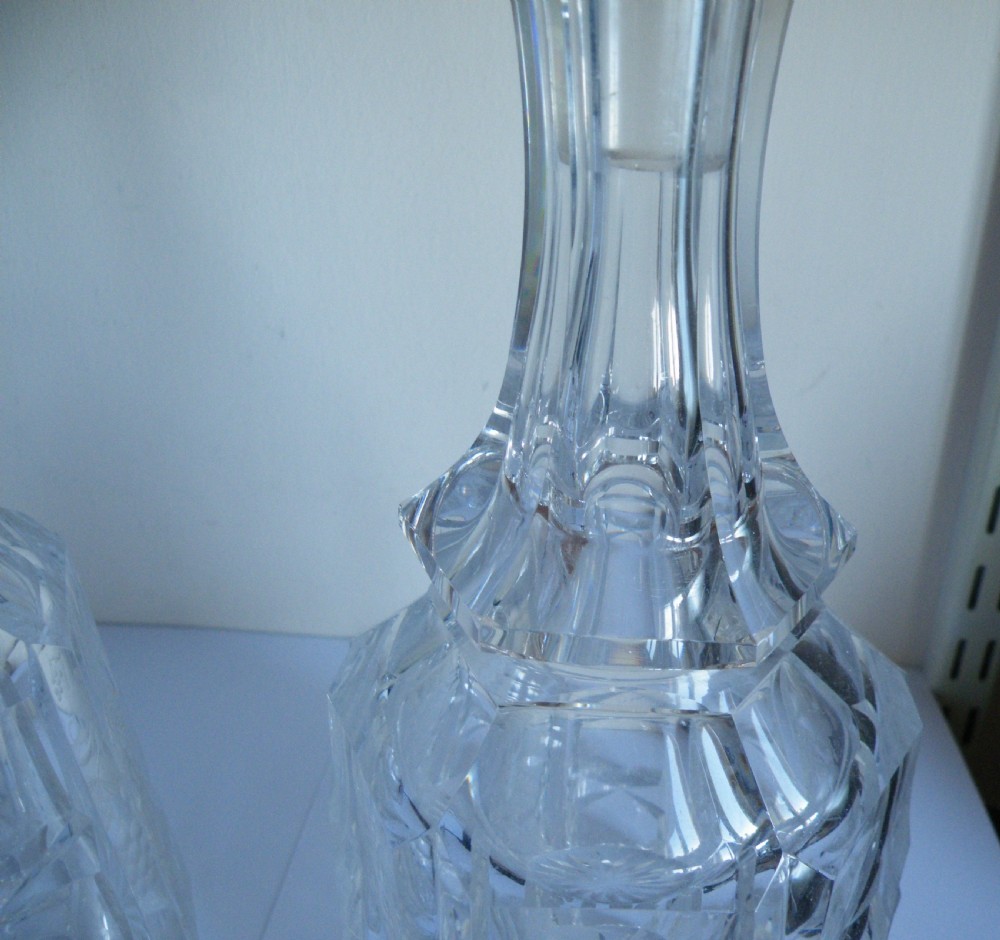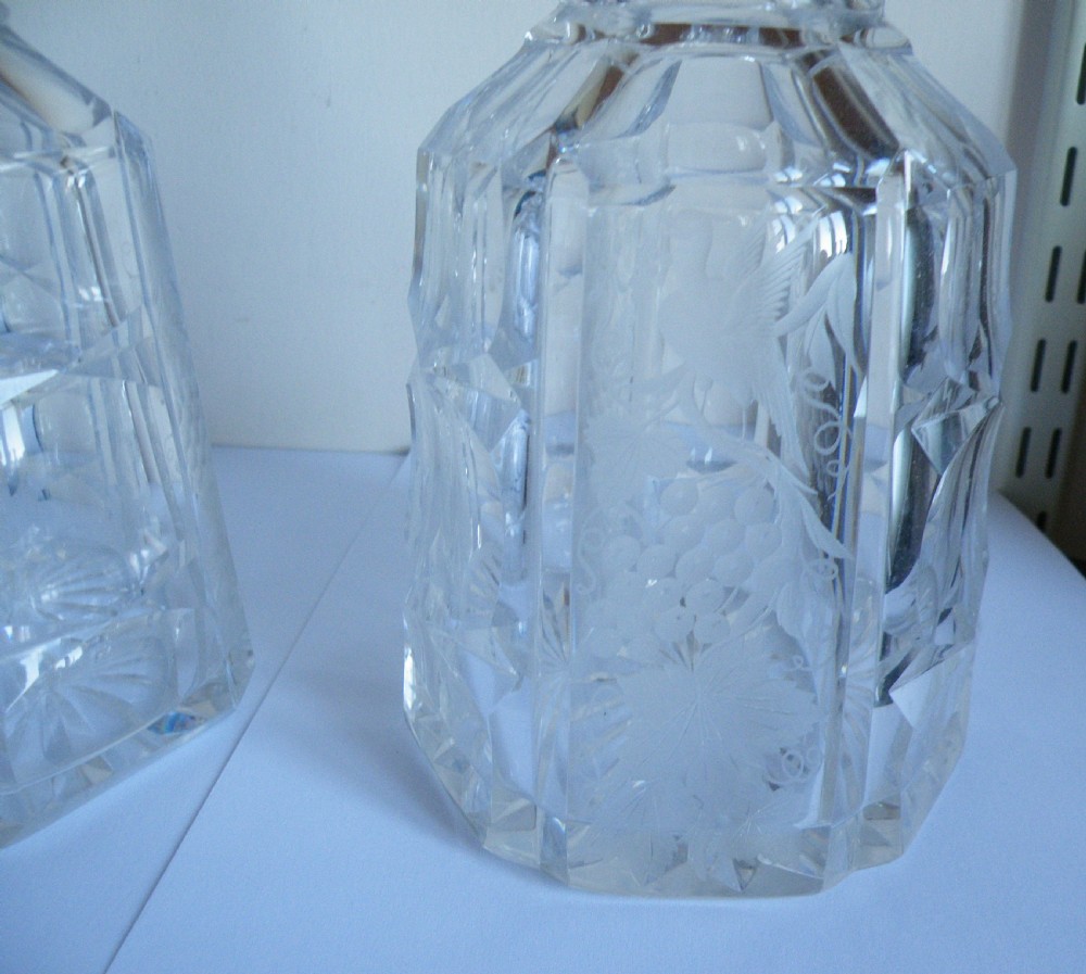 A GOOD QUALITY PAIR OF 19th CENTURY CUT AND ENGRAVED DECANTERS HAVING SIX CUT AND ENGRAVED PANELS WHEEL CUT WITH FRUITING VINES AND BIRDS TAPERED CUT NECK ORIGINAL STOPPERS SUPERB CONDITION HEIGHT TO TOP OF STOPPERS 32 cm HEAVY DECANTERS FREE UK POST ( IN TIME FOR CHRISTMAS ) WE WILL SHIP WORLDWIDE