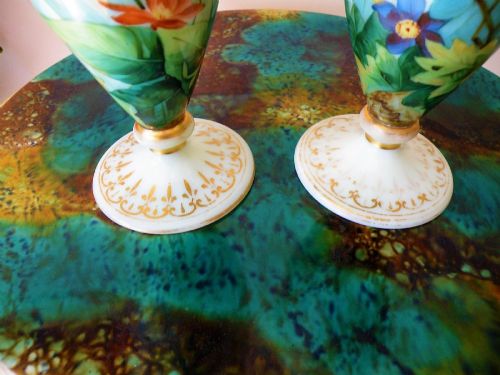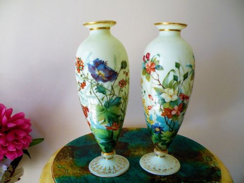 A SUPERB PAIR OF MID 19th CENTURY ENAMELLED OPALINE GLASS VASES HAVING BULBOUS TAPERING BODIES THE LIGHT GREEN COLOURED BODIES EXTENSIVELY ENAMELLED IN POLYCHROME COLOURS DEPICTING VARIOUS FLOWERS AND PLANTS GILDING TO THE RIMS AND FEET STANDING AN IMPRESIVE 12 INCHES TALL SOME EXPECTED RUBBING TO SOME GILDING OTHERWISE IN SUPERB CONDITION NO CHIPS NO CRACKS ________ BUYER PAYS POSTAGE