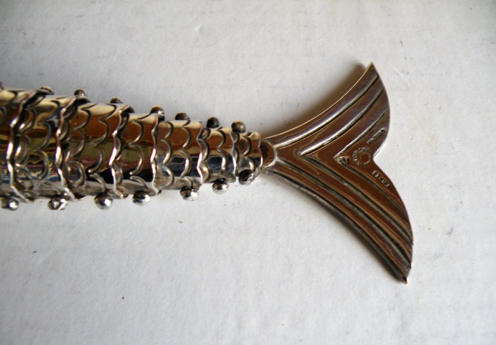 AN UNUSUAL LARGE VINTAGE SILVER PLATE ARTICULATED FISH BOTTLE OPENER