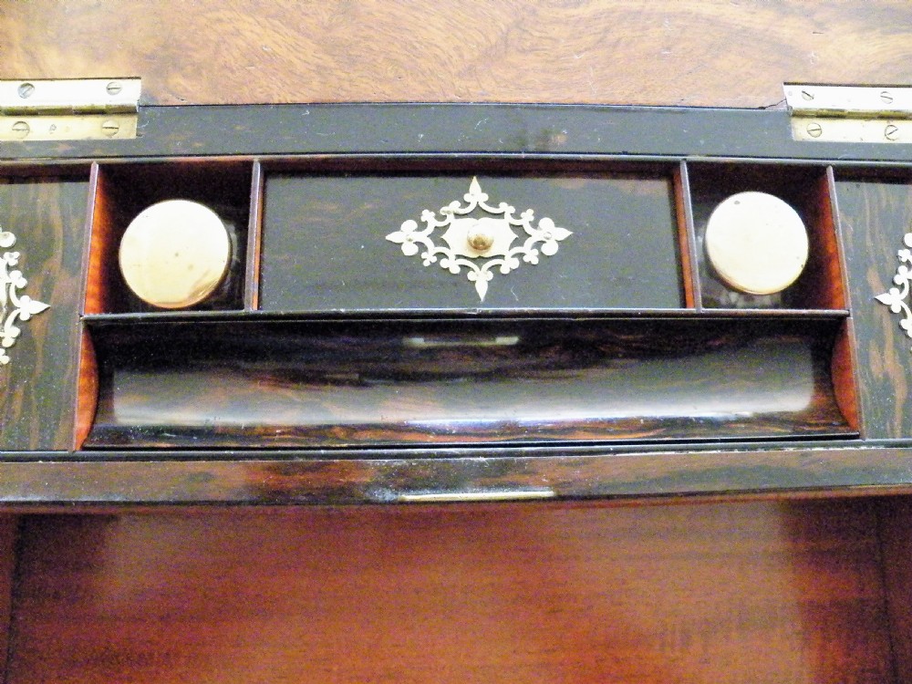 FITTED WITH THREE BRASS MOUNTED COMPARTMENTS, PEN COMPARTMENT AND TWO ORIGINAL GLASS INKWELLS WITH BRASS TOPS
