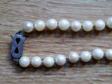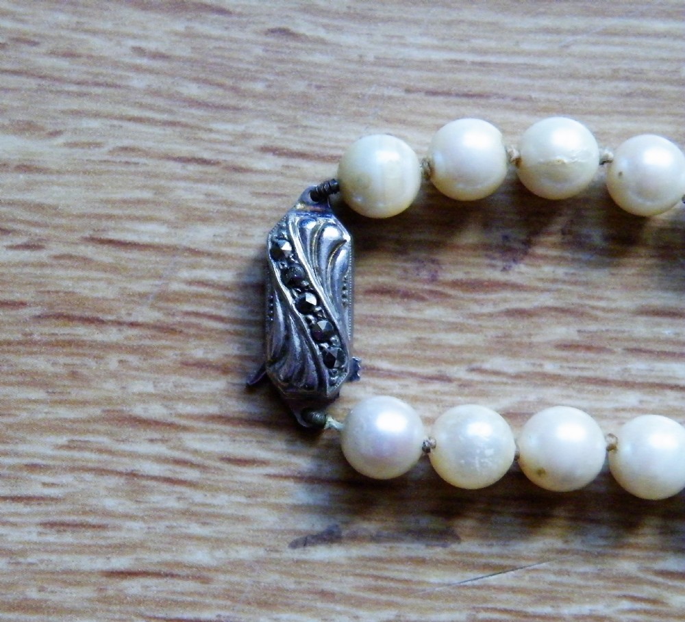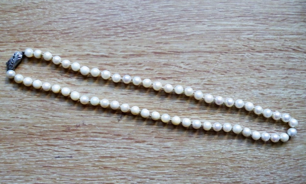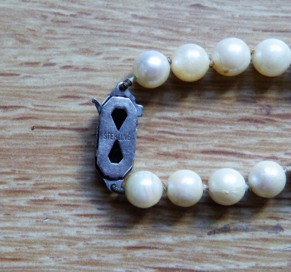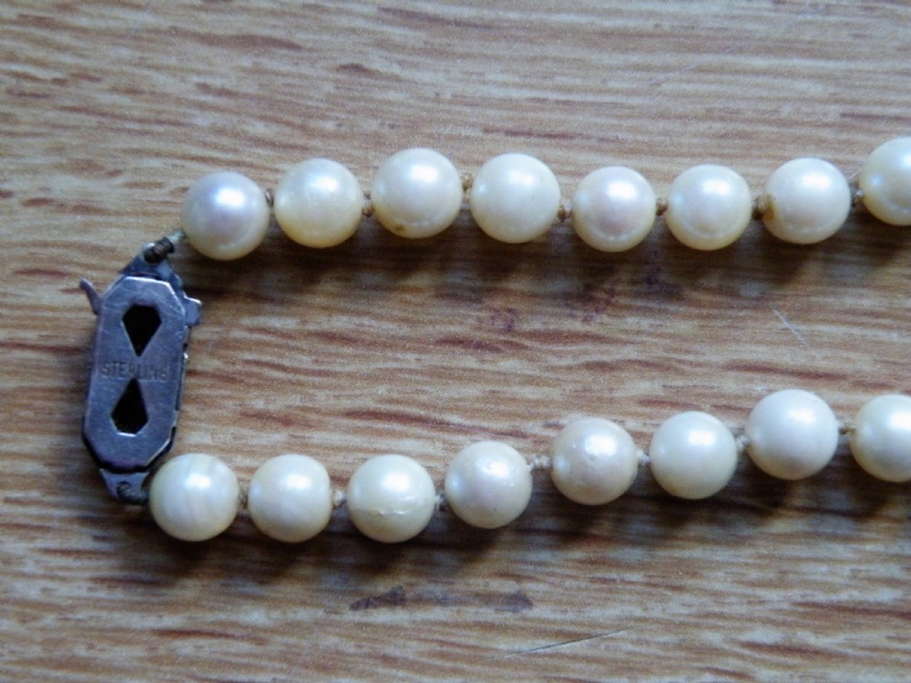 A 1940s VINTAGE CULTURED PEARL NECKLACE WITH A SILVER CLASP 18 INCHES