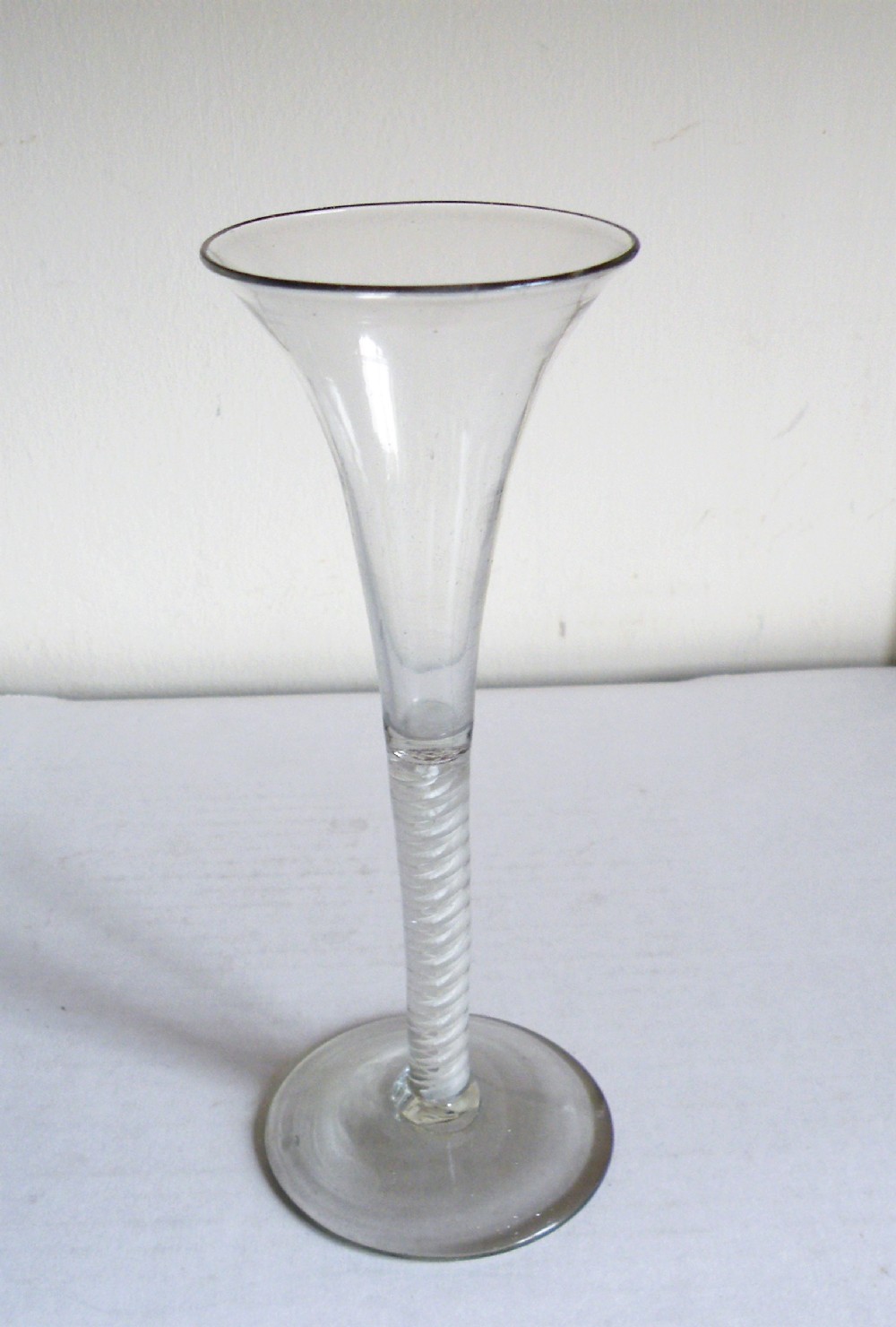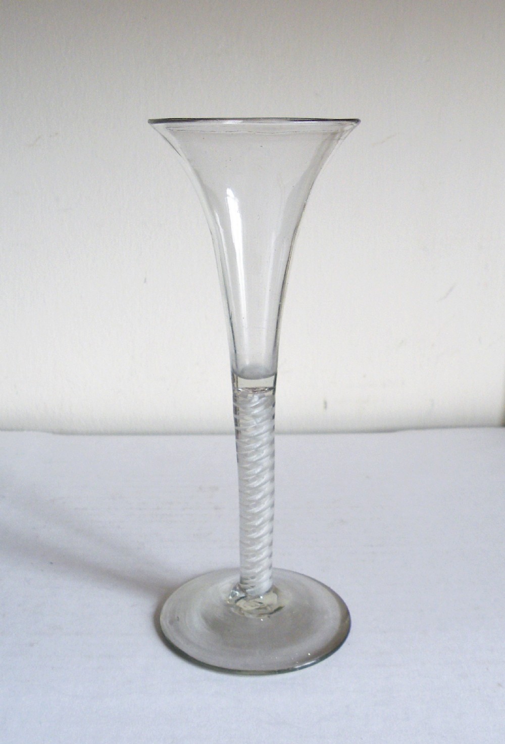 AN 18TH CENTURY OPAQUE TWIST STEM TALL WINE FLUTE CIRCA 1760 HAVING A DRAWN STEM FLUTE BOWL WITH A DOUBLE SERIES OPAQUE TWIST STEM SITTING ON A CIRCULAR CONICAL FOOT WITH A SHARP ROUGH PONTIL HEIGHT 7 INCHES BOWL DIAMETER 2.5 INCHES FOOT DIAMETER 2.75 INCHES NO CHIPS OR CRACKS GOOD CONDITION FREE UK POST WE WILL SHIP WORLDWIDE
