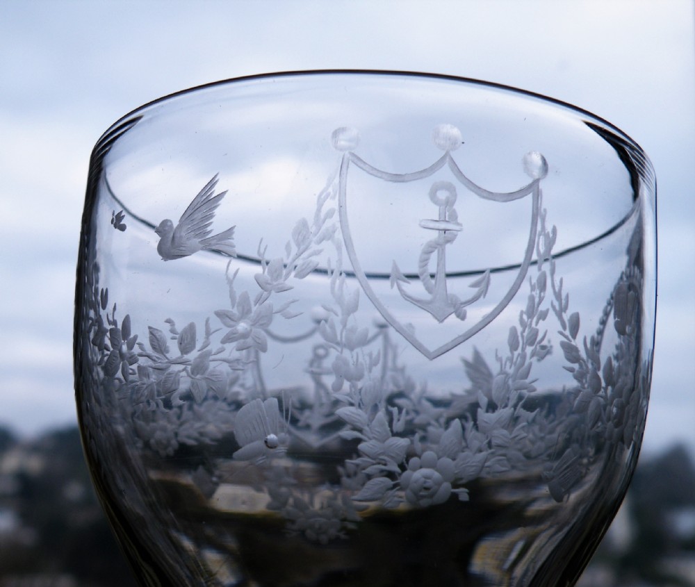 A LOVELY 18th CENTURY ENGRAVED GLASS RUMMER LARGE OVOID SHAPE BOWL COPPER WHEEL ENGRAVED WITH A CONTINOUS BAND OF FLORAL GARLANDS INTERSPERSED WITH TWO SHEILDS CONTAINING A TIED ANCHOR AND TWO OVAL PANELS CONTAINING A BOUQUET OF FLOWERS ALSO ENGRAVED WITH TWO DOVES CHASING AN INSECT AND SIX FLYING INSECTS THE ANCHOR IS THE SYMBOL OF HOPE AND THE DOVES A SYMBOL OF LOVE HAVING A BLADE KNOP SHORT CAPSTAN STEM WITH A LEMON SQUEEZER BASE HEIGHT 6.25 INCHES BOWL DIAMETER 4 INCHES WONDERFUL CONDITION A REALY GOOD GLASS WITH SUPERB ENGRAVING FREE UK POST WE WILL SHIP WORLDWIDE