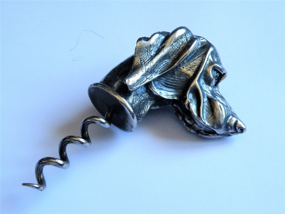 A SILVER PLATED BLOOD HOUND DOGS HEAD CORKSCREW THE WELL MODELLED HEAD MADE OF BRONZE AND SILVER PLATED STRONG CORKSCREW VERY HEAVY 302 GRAMS LENGTH 4 INCHES VERY GOOD CONDITION FREE UK POST WE WILL SHIP WORLDWIDE