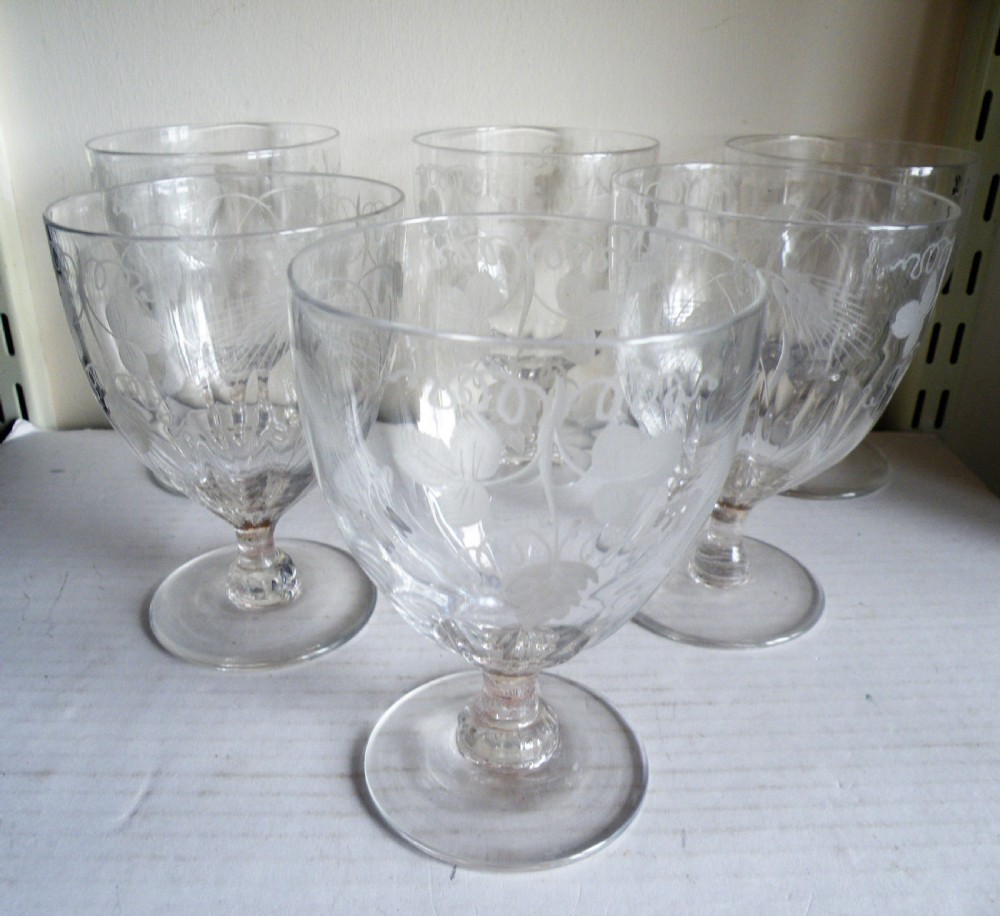 MANY MORE ANTIQUE GLASS ITEMS ON MY WEB SITE www.johnferrara-antiqueglass.co.uk.asp ________________________________________ A NICE HANDMADE ANTIQUE SET OF SIX ENGRAVED GLASS GOBLETS HAVING PETAL MOULDED GENEROUS SIZED BOWLS THE BOWLS WHEEL ENGRAVED WITH HOPS AND BARLEY SHORT STEMS CIRCULAR FEET WITH ROUGH PONTILS HEIGHT 12.5cm BOWL DIAMETER 9cm ONE HAS A BRUISE TO THE RIM OTHERWISE GOOD CONDITION READY TO USE FREE UK POST WE WILL SHIP WORLDWIDE MANY OTHER ITEMS ON MY WEB SITE www.johnferrara-antiqueglass.co.uk.asp