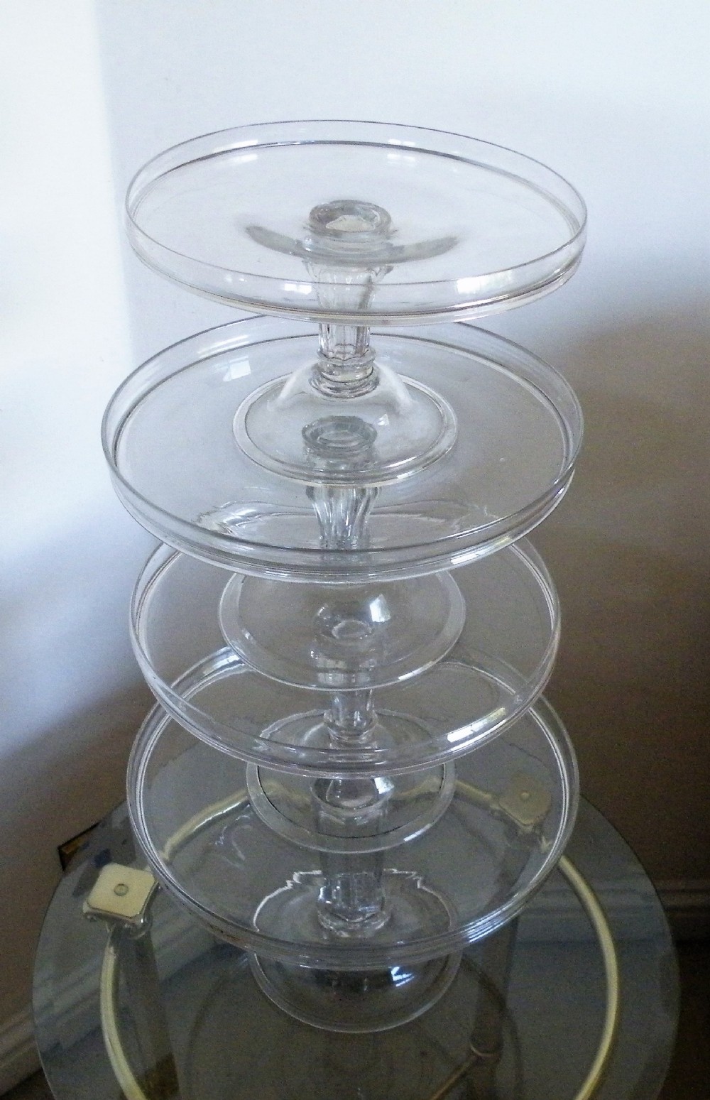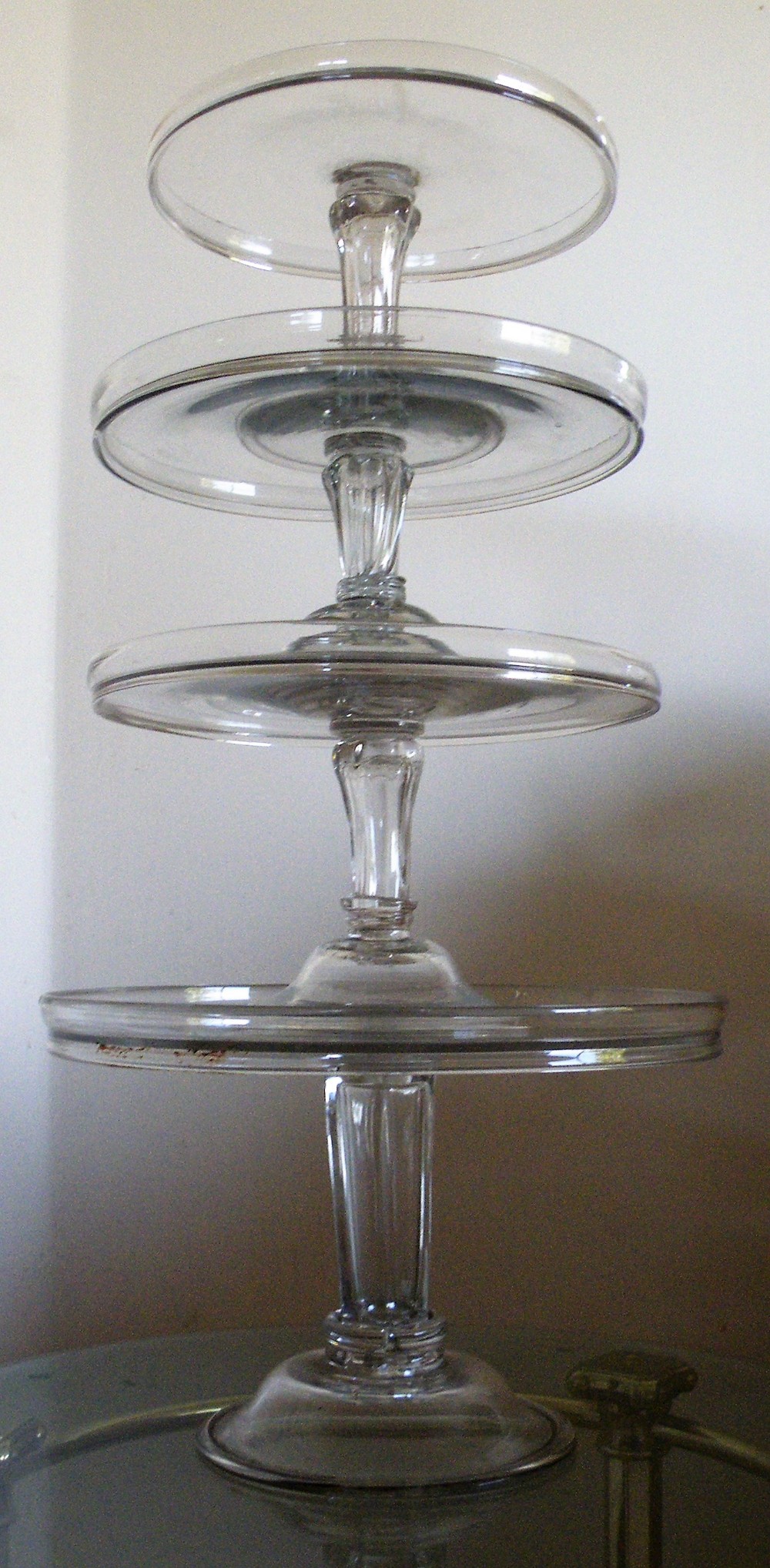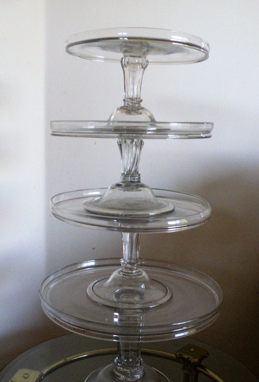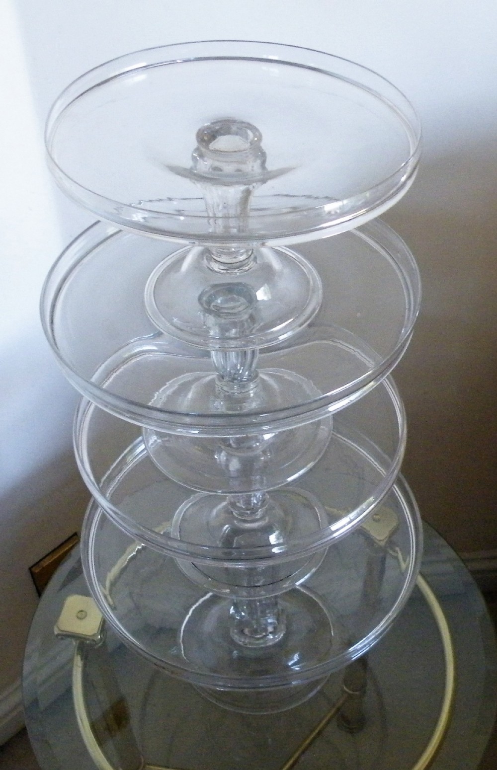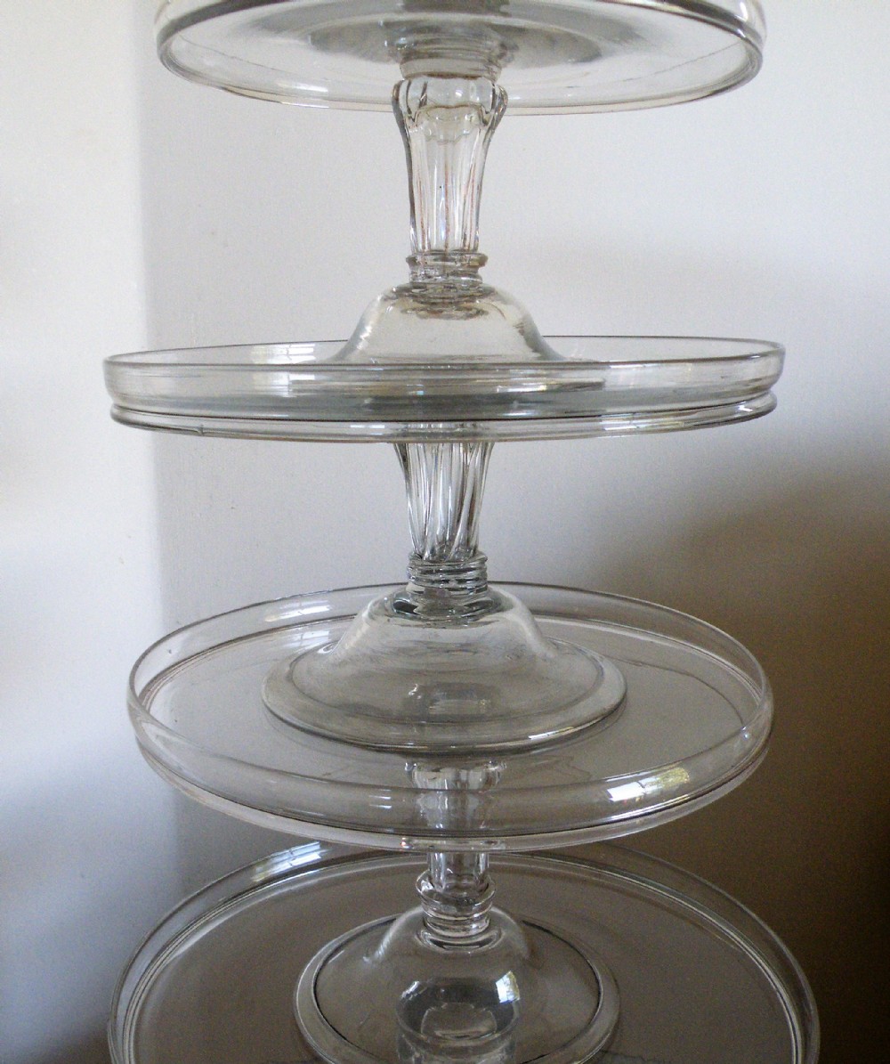 MANY MORE ANTIQUE GLASS ITEMS ON MY WEB SITE www.johnferrara-antiqueglass.co.uk.asp ________________________________________ AN EXTREMELY RARE PYRAMID OF 18th CENTURY GEORGIAN GLASS TAZZA'S CONSISTING OF FOUR TAZZA EACH TAZZA HAS A DEEP RIM AROUND THE CIRCULAR PLATE SUPPORTED BY A MOULDED HOLLOW SILESIAN STEM WITH COLLARS IN TURN SITTING ON A DOMED AND FOLDED FOOT DIAMETER OF BOTTOM TAZZA 30cm DIAMETER OF TOP TAZZA 23cm TOTAL HEIGHT APPROX' 60cm ALL IN FINE UNDAMAGED CONDITION CIRCA 1780 A VERY RARE ITEM FREE UK POST WE WILL SHIP WORLDWIDE MORE ITEMS CAN BE SEEN ON MY WEB SITE www.johnferrara-antique.co.uk.asp